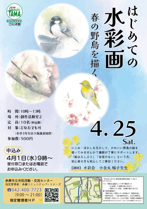 生涯学習講座「はじめての水彩画」 イベント 4月25日(土)に生涯学習講座「はじめての水彩画」を開催します。 ご参加をご希望の方はお電話または受付窓口にてお申込みください。 皆様のご参加お待ちしております!