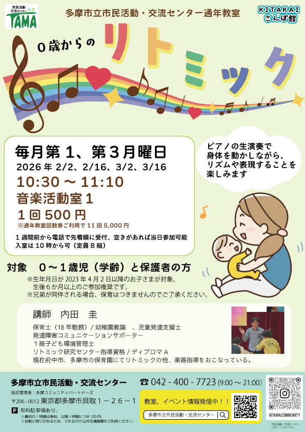 毎月第1、第3月曜日に通年教室「リトミック」を開催します!