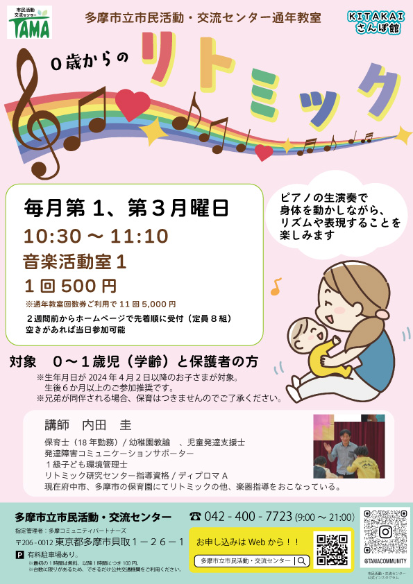 毎月第1、第3月曜日に通年教室「リトミック」を開催します。